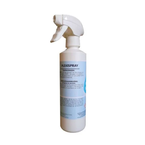 Plexispray kunststof reiniger is een high performance reiniger, speciaal ontwikkeld voor het reinigen van acrylaat (PMMA – Plexiglas) en andere kunststoffen. Eenvoudig gebruik door de sprayflacon. Waar traditionele alcoholhoudende middelen een risico op barstvorming en mattering vormen, verzekert deze spray een krachtig ontvettend en reinigend effect zonder degradatie. Het product heeft een reinigende functie maar géén desinfecterende functie. De kunststof reiniger heeft een antistatische werking.